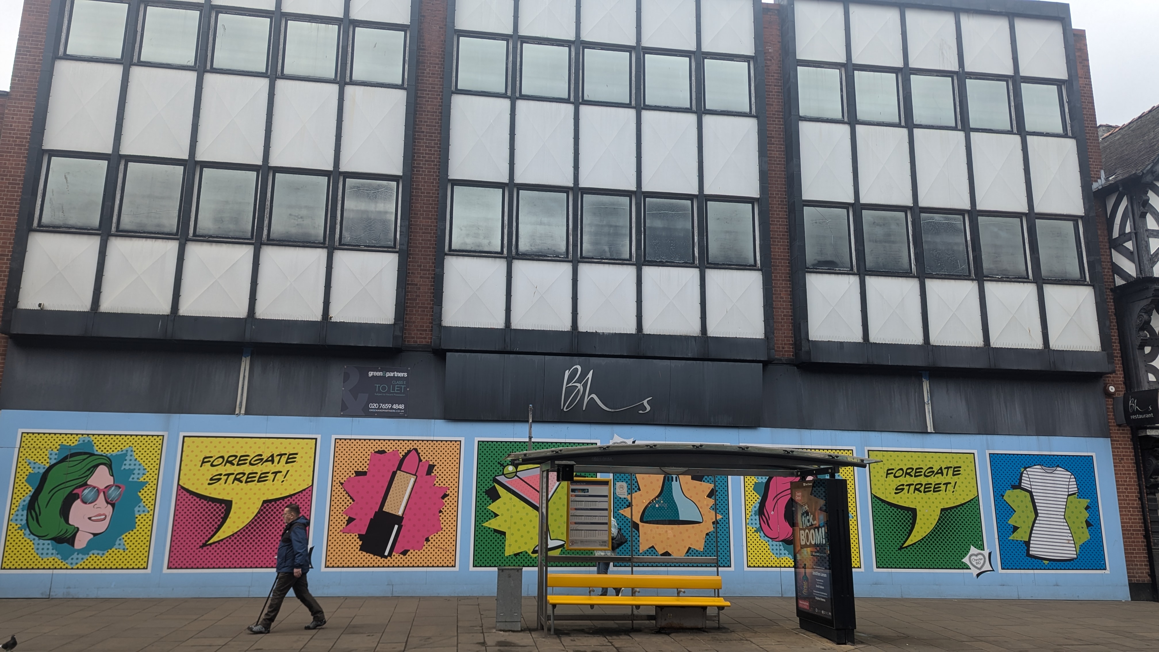 - 3. BHS has been empty on Foregate street since August 2016. Foregate street in general has been boosted by the relocated larger Poundland, Starbucks and the long awaited Home Bargain. Retail giant BHS collapsed in 2016, with Chester’s branch closing in August of 2016. A “To Let” sign has recently been added to the front of the massive unit which is decorated with colourful Chester BID pop art influenced signage. Since closure , some suggested moving the market there but the high rent and rates ended this fantasy. Due to its huge size, this is another unit which would benefit from splitting into smaller parts. In 2019 44% of former BHS stores were still vacant, by 2021 this had dropped to 20%. Any interested tenants can apply here : https://www.greenandpartners.co.uk/property/4145-foregate-street-chester/high-street