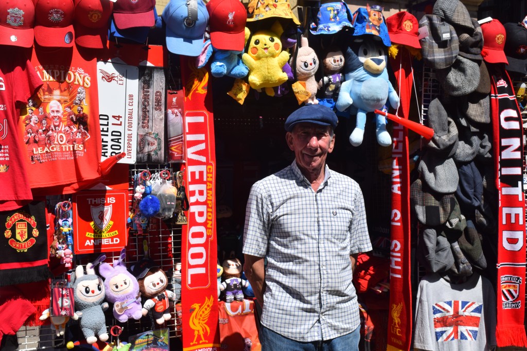 “In the summer time its busy most days. When it goes quiet in the winter I usually just do Friday to Monday and have the rest of the week off. The footfall has not come back since Covid. It gives me a purpose, to get out of bed in the morning. My wife passed away 6 years ago . I have people from all over Chester and all over the country coming to see me. I had two ladies from Somerset before and a guy from Canada, and some people from Argentina buying some magnets off me. I try to give them as much information as I can about the history of Chester and the quirky little lanes and sayings of Chester. Best seller at the moment is the Liverpool T shirts!!