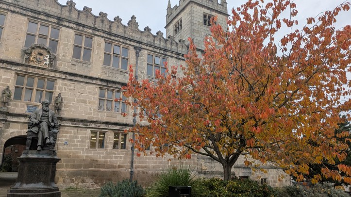 A woman with a dog smiles at me as I get off the train, disembarking at the stately home like train station. I can immediately feel the vibrancy of the town, few empty units, street art, clean and tidy streets and footfall easily as high as Chester. No doubt a certain percentage of locals are complaining online about how awful everything is. This is a positive place make no mistake, it feels like good things are happening here, as opposed to some of the hopeless spots I’ve visited. Charles Darwin, the city’s most famous son sits proudly outside the library. Other local notables include footballer Joe Hart and Cadfael the Monk. You could also add gardener Percy Thrower, but he wasn’t born here.
