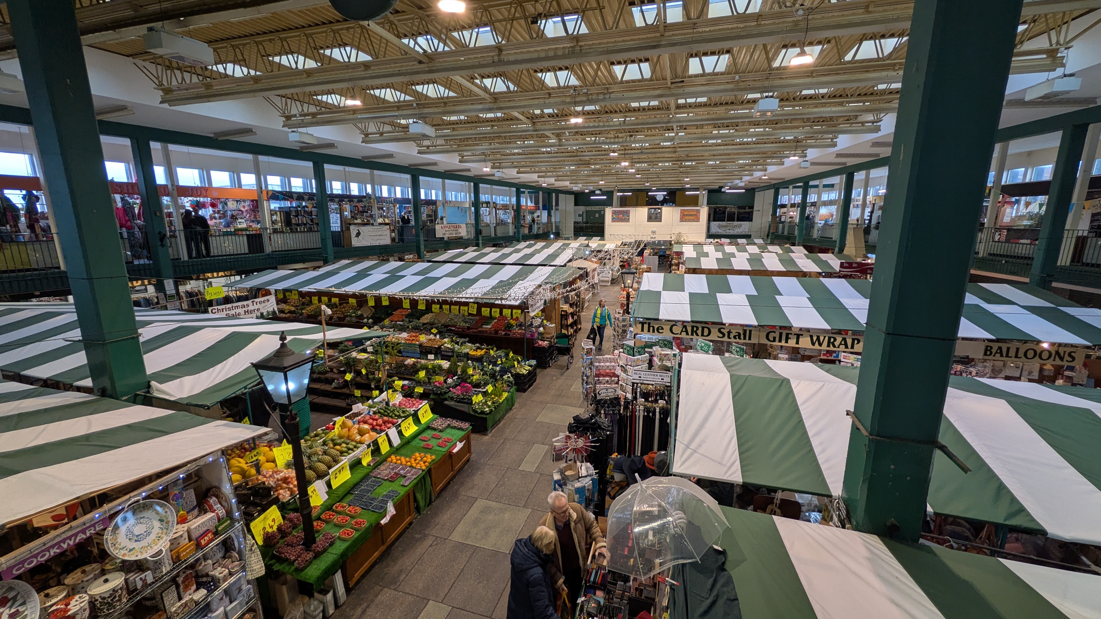 The area around the market is equally vibrant despite the closed down Bodycare, and is home to one of the few remaining Wimpys in the North. I enter the award winning Shrewsbury Market, 4 times voted the best in Britain. Its hard to disagree, with an excellent mix of traders and varied food and drink offering . The stalls evoke the golden age of markets with handwritten signs on the fruit and veg and a bustling environment. Display boards reveal the background and history of some of the key traders An upper floor houses craft and art shops, none of which would have lasted long in Chester. It’s clear this market is well supported, a happy place, as contrasted with the old Chester Market which died from lack of support and interest. There is a zero waste stall, ( like Just Footprints in Chester which closed), a Haberdashers, again not supported in Chester. A comment on my blog lays out the familiar “food hall” argument. People ignore the fact that before food traders were added to the mix in 2017, no one was championing Chester Market, period. I walk around the upper floor several times, browsing books and trinkets and art, you could spend a good while in here, with a record shop and several home/ gift shops. The top floor showcases the history of the market which opened in 1965, its controversial modern design the subject of mixed emotions over the years, surrounded by so many historic buildings. The history also echoes Chester, with the demolition of a previous historic market hall. Clearly Chester and Shrewsbury went down different routes despite similar origin stories. The Market here deserves all its accolades and is a lovely place to visit. Plus, Bobby Ball, The Bachelors and The Nolans all performed here in the 1990s.