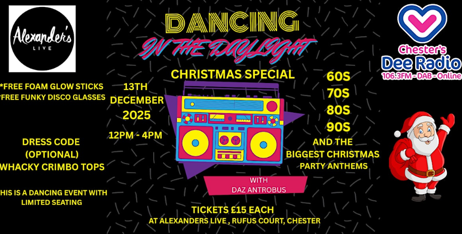 Dee Radio’s very first daytime disco – Dancing in the Daylight – is coming to Alexander’s Live, on Rufus Court in Chester.It’s on Saturday the 13th of December, between 12 pm and 4 pm, and tickets are on sale now.
