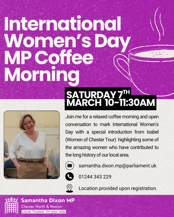 Residents are warmly invited to join Samantha Dixon MP for a relaxed coffee morning and open conversation to mark International Women’s Day (IWD) on Saturday 7th March, 10:00am–11:30am.