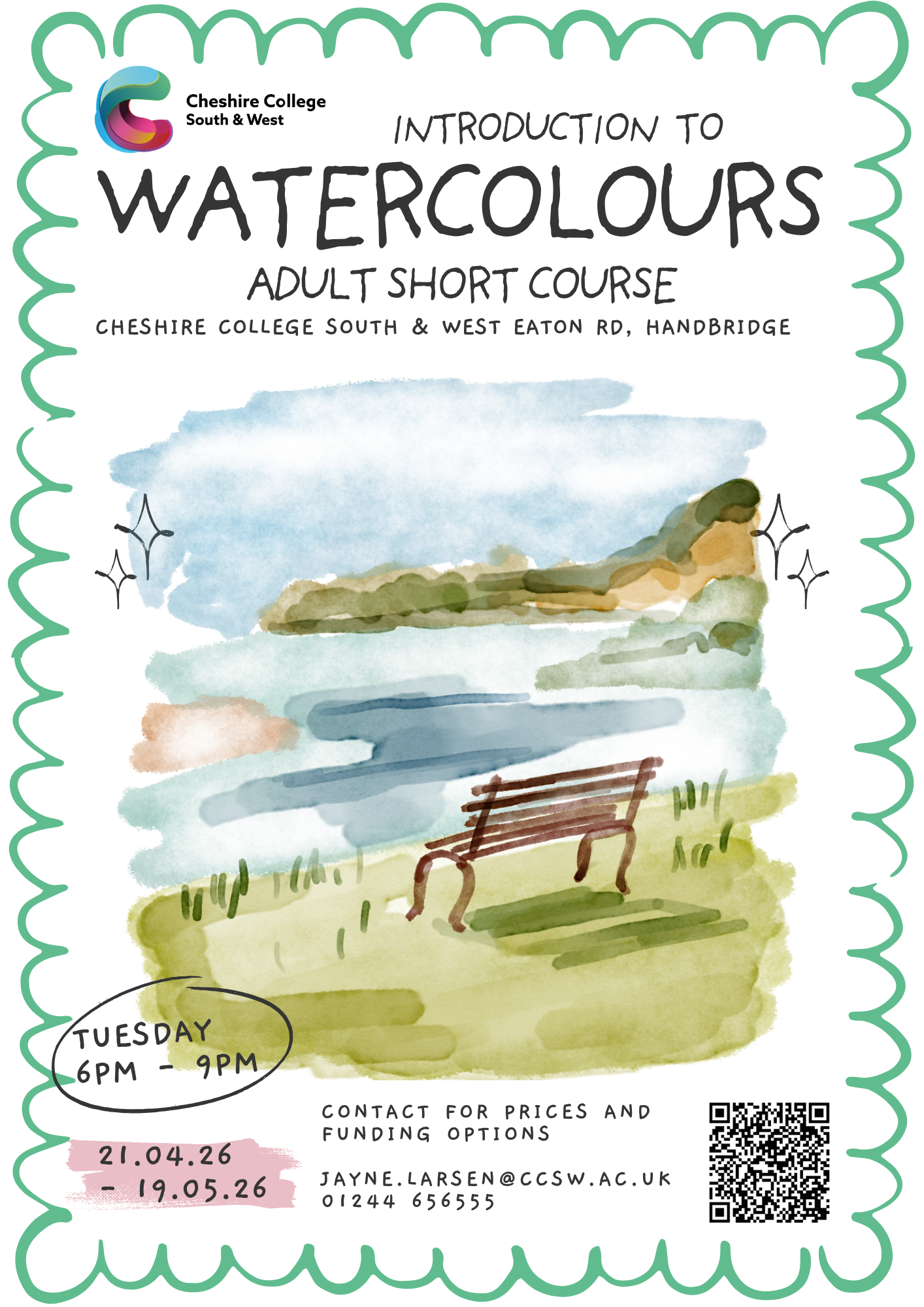 The course begins Tuesday 21st April 2026 and runs for four weeks, taking place each Tuesday at the Handbridge campus from 6 – 9pm. It’s designed as a beginner-friendly course for adults who would like to try watercolour, learn some simple techniques, and enjoy a creative evening for a few hours each week!