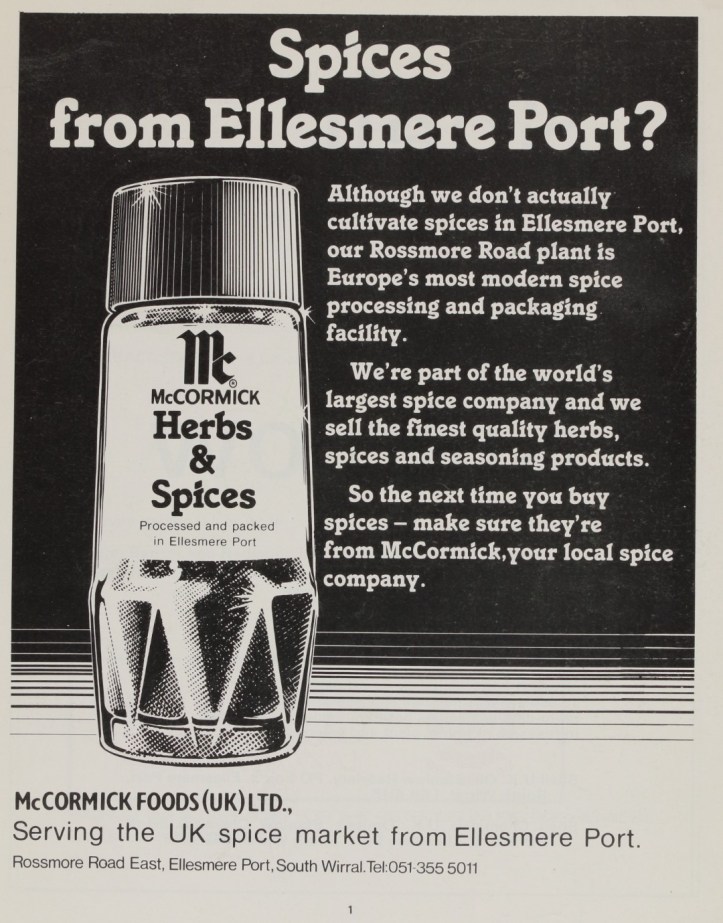A flavourful reminder of something you might not expect to be connected to Ellesmere Port: spices. The late‑1970s advert from McCormick Foods highlights the company’s plant on Rossmore Road, described at the time as ‘Europe’s most modern spice processing and packaging facility.’ While the spices themselves weren’t grown locally, they were processed and packed right here in Cheshire before making their way onto shelves across the UK.