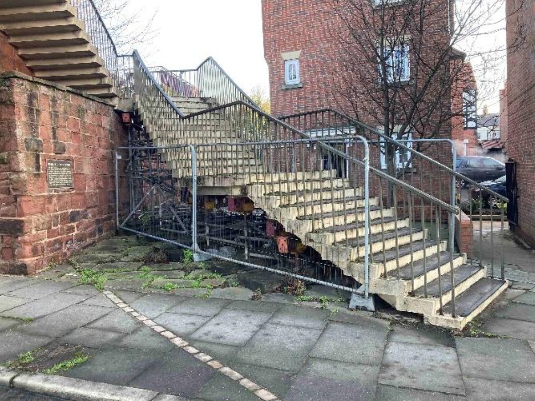 The steps on either side of St Martin’s Gate have been propped up for many years providing an image of neglect and a sense of lack of maintenance. They are viewed from both the City Walls and the Inner Ring Road. The gate is a prominent feature and part of Chester’s 20th century heritage. On the western side there is a plaque adjacent to the steps informing readers that the gate and viaduct beyond were opened by Babara Castle in 1966 (then Minister of Transport). Furthermore, and significantly, the steps on the eastern side have a sweep that approximates to that of the rounded north-eastern angle of the Roman fortress, which is also marked out in the pavement below the steps but largely hidden by security fencing, scaffolding and supports.